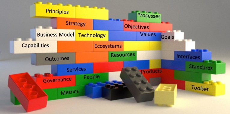 to easily produce new business outcomes without having to deal with the complexities which are already defined within the individual building blocks – just like a Lego set using the same set of standardised and pre-defined blocks to build completely different things. The focus is on re-using the blocks and not on the design of the blocks itself. Off course a lot of thinking has gone into the design of the different building blocks, but through re-using the same block designs, the model design time is focussed on a new/different outcome and not on a component of an outcome.